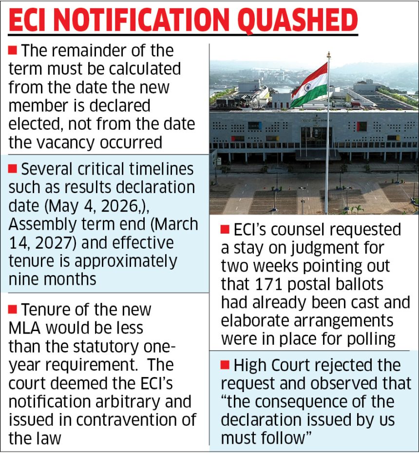 NT Reporter Panaji In a first in Goa’s political history, the High Court of Bombay at Goa on Wednesday quashed the Election Commission of India’s notification for the bypoll to…