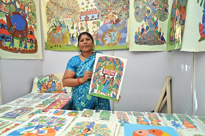 The display includes Gond paintings from Madhya Pradesh, known for their storytelling motifs inspired by nature and folklore, along with Assam’s Mekhala Chador textiles, jute crafts, Mooj grass products from Uttarakhand, Banjara embroidery from Maharashtra and woodcraft from Meghalaya.