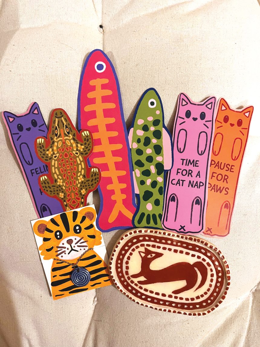 Studio Yakisoba sells and takes commissions for traditional paintings in oil and acrylic as well as digital art. Alongside these are ceramic jewellery, totes, bookmarks, postcards, stickers, pins, coasters, calendars, posters and canvas prints. “The list is always growing and changing,” she says. Recurring motifs thread through the variety. “Cats, fish, mental anguish and inner turmoil, Goan culture, and pop culture,” she lists.