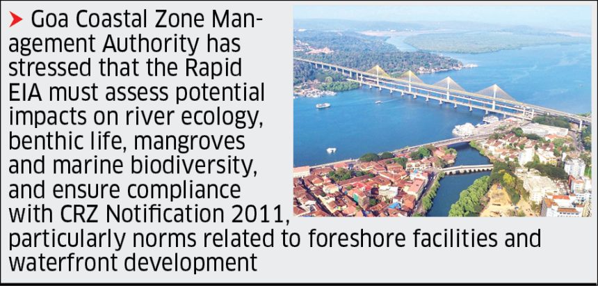 GCZMA has stressed that the Rapid EIA must assess potential impacts on river ecology, benthic life, mangroves and marine biodiversity, and ensure compliance with CRZ Notification 2011, particularly norms related to foreshore facilities and waterfront development.