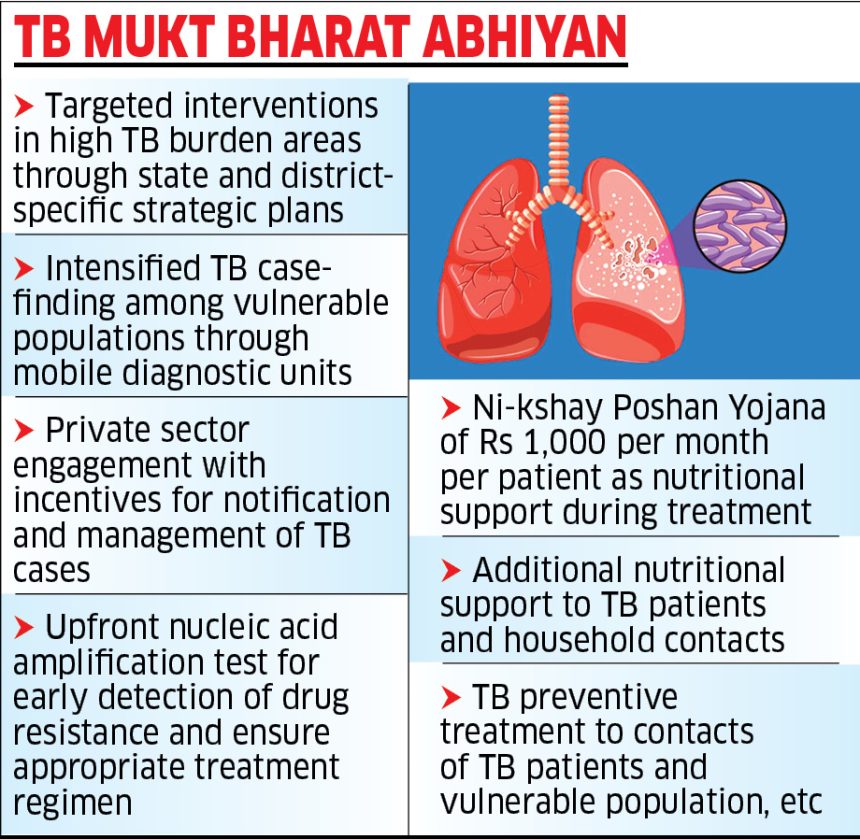 The other measures include private sector engagement with incentives for notification and management of TB cases, upfront nucleic acid amplification test (NAAT), for early detection of drug resistance and ensure appropriate treatment regimen, Ni-kshay Poshan Yojana of Rs 1,000 per month per patient as nutritional support for the entire duration of treatment, provision of additional nutritional support to TB patients and household contacts under Ni-kshay Mitra initiative, provision of TB preventive treatment to contacts of TB patients and vulnerable population, etc, in addition to intensified Information, Education and Communication (IEC) interventions to reduce stigma, enhance community awareness and improve health seeking behaviour.