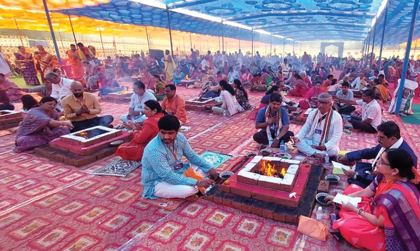 The devotees offer Samidha to the 54 Havan Kunds during the Samashti Shri Hanuman Chalisa Havan ritual, organised at Campal, on Sunday as a part of the Chinmaya Amrit Mahotsav 2026. | Nandesh Kambli