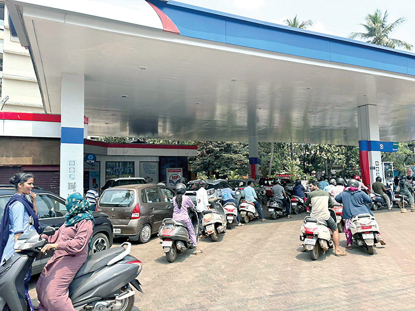Vehicle owners queued up at a fuel station in Ponda on Wednesday amid panic buying triggered by fears of a fuel shortage. Some gas agencies in the town also continued to witness crowds over concerns of an LPG crunch though home delivery services are being assured. The rush comes in the wake of uncertainty following the Gulf conflict, prompting residents to stock up despite fuel station dealers maintaining that adequate supplies are available. Such queues were witnessed at fuel stations across the state. ¡ Mahesh Gaonkar