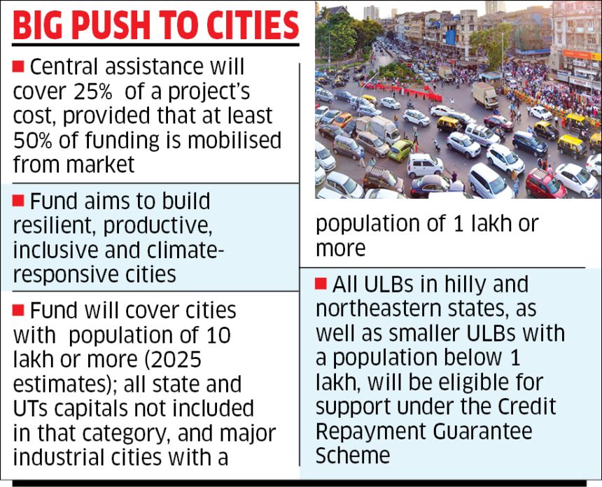Additionally, all ULBs in hilly and northeastern states, as well as smaller ULBs with a population below 1 lakh, will be eligible for support under the Credit Repayment Guarantee Scheme. In principle, all cities will be covered under the UCF, it said.