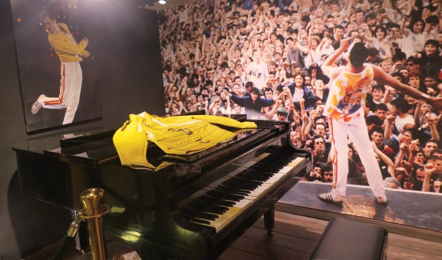 Pictured is the iconic yellow military jacket Mercury debuted on Queen’s whirlwind 1986 ‘Magic Tour’, draped here over a grand piano that has seen better days. The museum also has the red-and-white cotton twill military-inspired jacket designed by Dian Moseley that he also wore on that tour, along with information on the black-and-white and orange-green-white diamond-patterned low-cut Harlequin unitard outfits (inspired by costumes worn by legendary ballet star Vaslav Nijinsky in ‘Carnaval’ 1910 featuring traditional commedia dell’arte characters and designed by Léon Bakst) about which I’ve written in an earlier column.