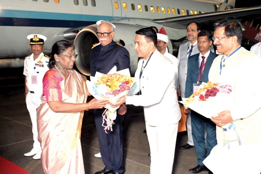 President Droupadi Murmu, on her arrival in Goa, was welcomed by Governor Pusapati Ashok Gajapathi Raju and Chief Minister Pramod Sawant at INS Hansa, Vasco on Saturday evening. Union Minister Shripad Naik was also present. On Sunday, the President will take a sea sortie in a submarine from Karwar Harbour, Karnataka, before visiting Jharkhand.