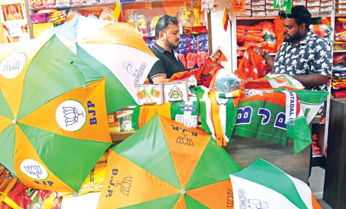 Umbrellas and flags of Bharatiya Janata Party and Congress are put on display at a shop ahead of the Lok Sabha elections, in Bengaluru on Monday. | ANI